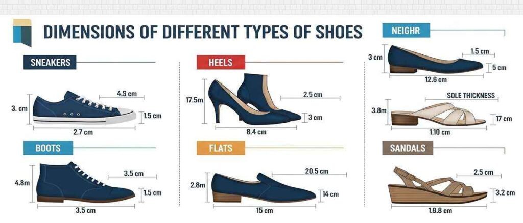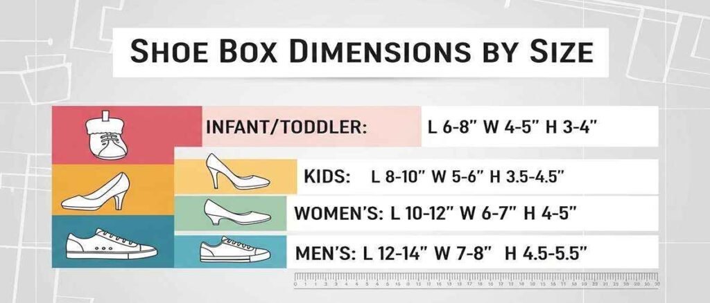 The average shoe box dimensions vary slightly but follow common standards in markets. Men’s shoe boxes are usually around 13 x 7.5 x 4.5 inches. Women’s shoe boxes are approximately 14 x 7 x 4 inches. Kids’ shoe boxes are smaller, nearly 10 x 6 x 3.5 inches. These sizes represent typical packaging characteristics used by retailers.